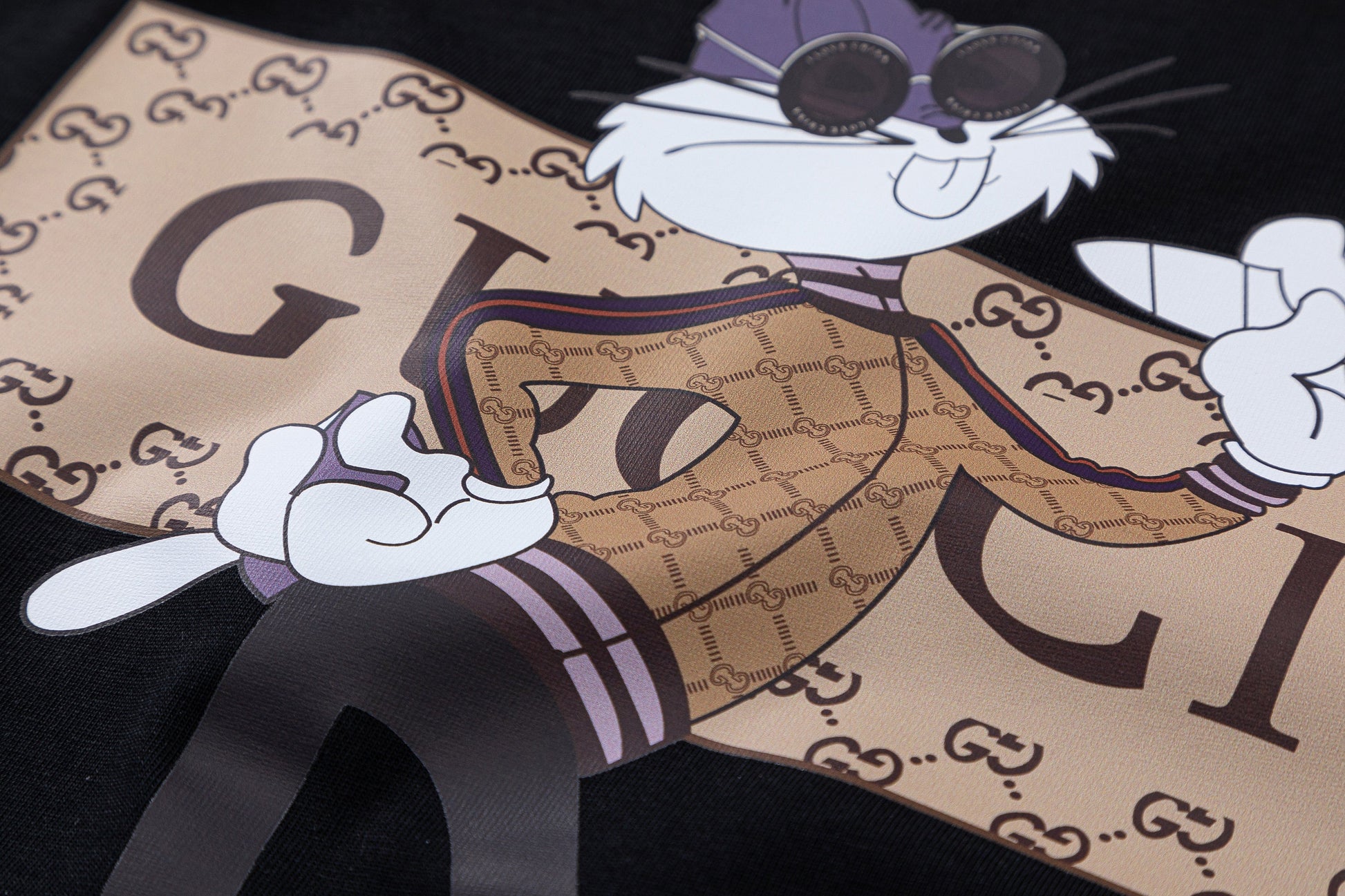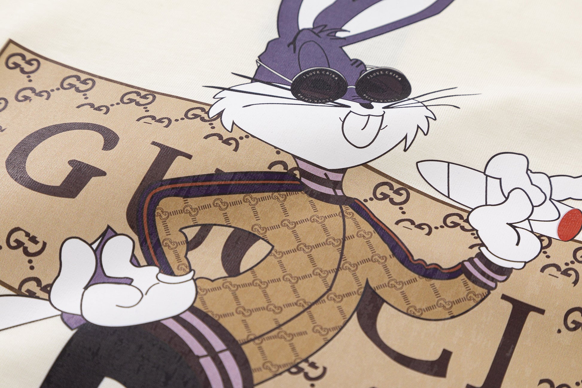 O destaque desta peça é a estampa encantadora de uma lebre usando óculos redondos, adicionando um toque de charme e humor ao visual. Cada detalhe é meticulosamente trabalhado para criar uma estampa nítida e vibrante, refletindo a dedicação da Gucci em oferecer designs únicos e cativantes.