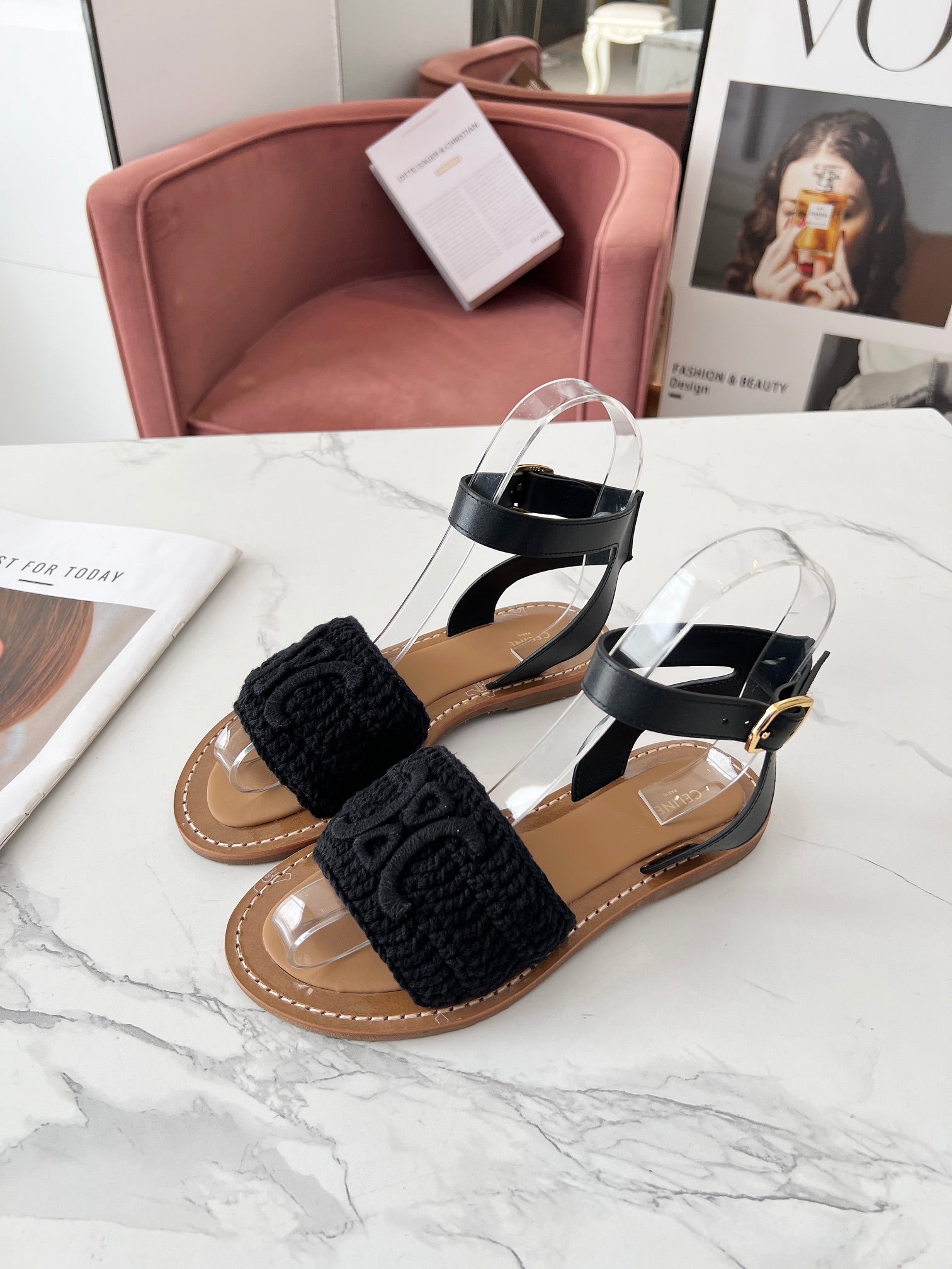 CELINE LYMPIA SANDAL in TRIOMPHE MACCRAMÉ COTTON & CALFSKIN