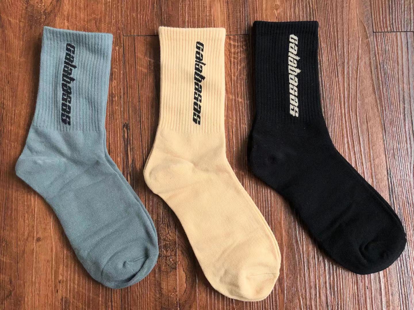 A sexta coleção da marca direcional de Kanye West, Yeezy, vê formas inovadoras em fabricação de luxo informadas por um estilo industrial e utilitário. As meias Calabasas são fabricadas com uma técnica de mistura de algodão em um tecido tricotado com nervuras e vêm em cores de um núcleo, uma areia e uma geleira.